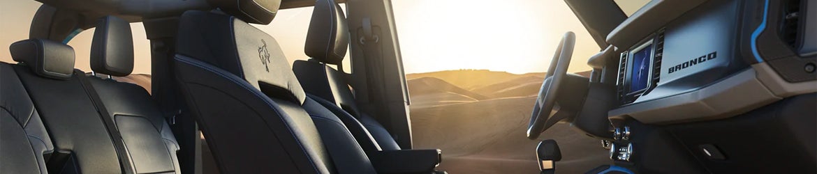 The Bronco has a six-speaker audio system, folding rear seats, SiriusXM satellite radio, an 8-inch touchscreen, Android Auto and Apple CarPlay compatibility, push-button start, keyless entry, an 8-inch driver instrument panel, and cruise and audio controls for the steering wheel. You can add dual-zone automatic climate control, a 10-speaker sound system with a subwoofer, a 12-inch touchscreen, and navigation. Voice recognition, remote start, ambient lighting, an auto-dimming rearview mirror, wireless charging, and a heated, leather-wrapped steering wheel are available as well.
