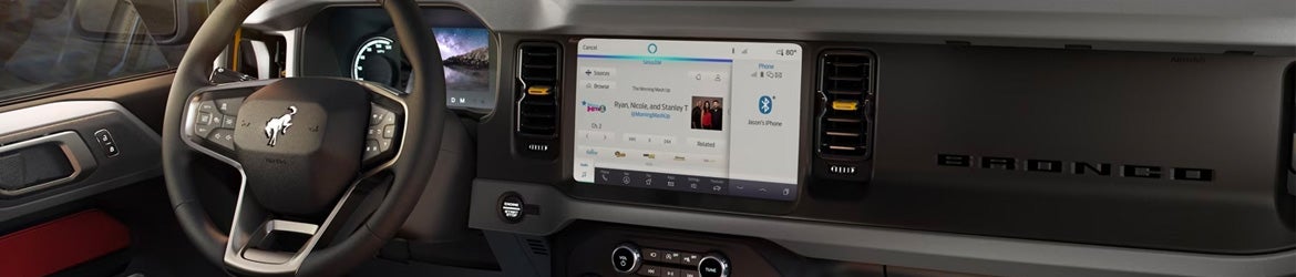 The Bronco has a 7-speaker audio system, folding rear seats, SiriusXM satellite radio, an 12-inch touchscreen, Android Auto and Apple CarPlay compatibility, push-button start, keyless entry, an 8-inch driver instrument panel, and cruise and audio controls for the steering wheel. You can add dual-zone automatic climate control, a 10-speaker sound system with a subwoofer, a 12-inch touchscreen, and navigation. Voice recognition, remote start, ambient lighting, an auto-dimming rearview mirror, wireless charging, and a heated, leather-wrapped steering wheel are available as well.