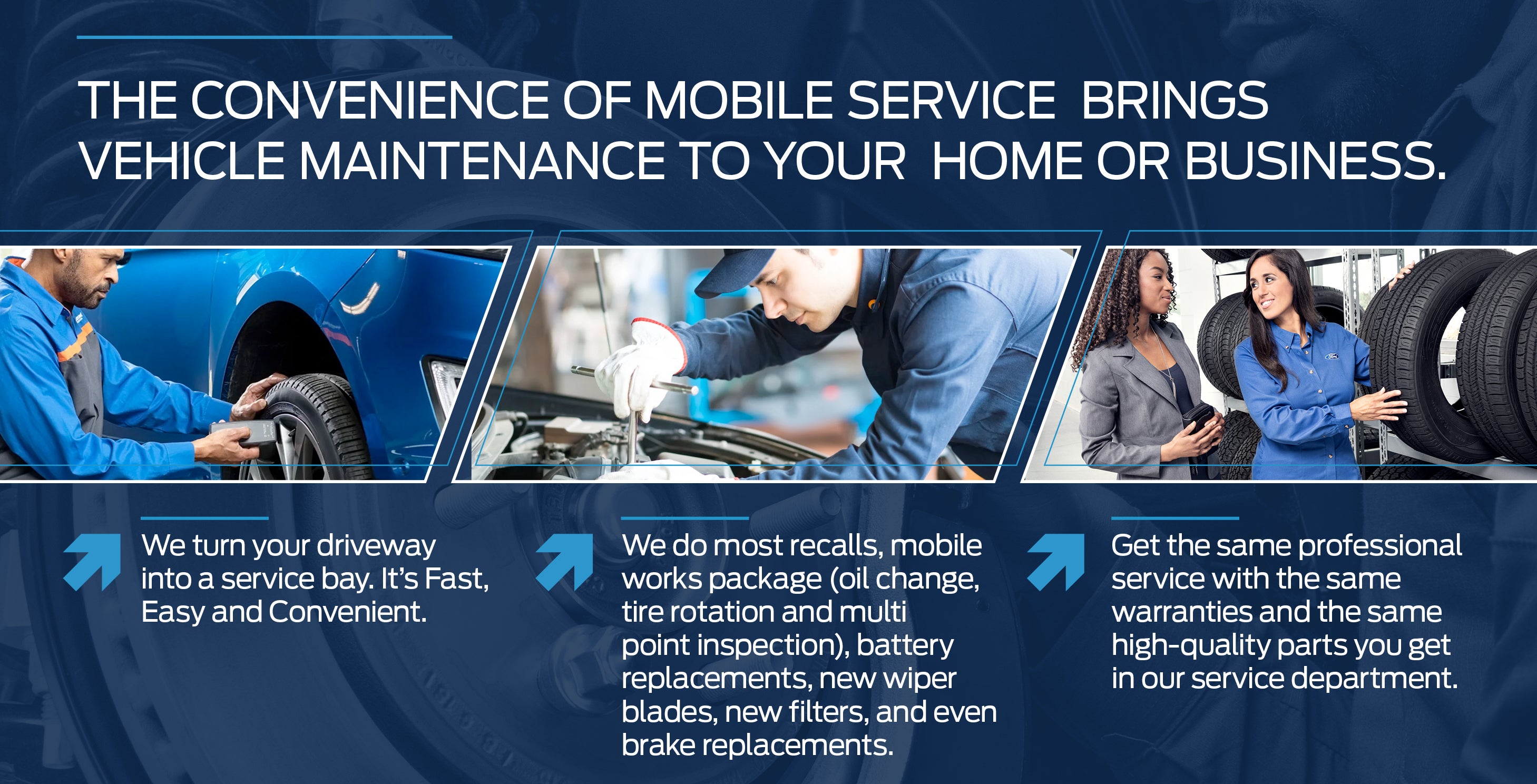 Book a mobile appointment today and receive the quality and expertise from Ford trusted technicians using Ford parts.