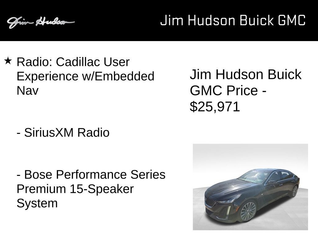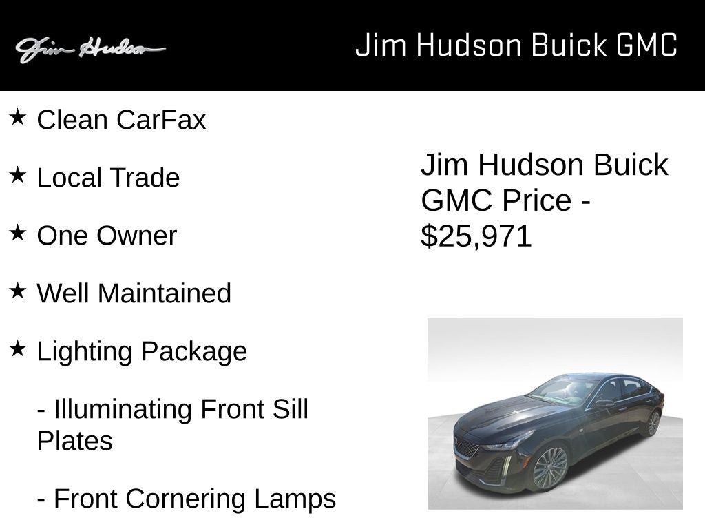 2020 Cadillac CT5 Premium Luxury Clean CarFax, Local Trade, One Owner, Well Maintained, 8 Diagonal Color Reconfigurable DIC Display, Advanced Adaptive Cruise Control, Alloy Pedals, Automatic Heated Steering Wheel, Automatic Seat Belt Tightening, Climate Package, Door Lock & Latch Shields, Driver Assist & Advanced Security Package, Driver Awareness Plus Package, Driver Manual Cushion Length Adjustment Seat, Driver Power Lumbar Massage Seat, Driver Power Seatback Bolster Adjustment, Enhanced Automatic Emergency Braking, Following Distance Indicator, Front Passenger Manual Cushion Length Adjustment, Front Passenger Power Lumbar Massage Seat, Front Passenger Power Seatback Bolster Adjustment, Head-Up Display, Heated Driver & Front Passenger Seats, IntelliBeam Automatic High Beam On/Off, Lane Keep Assist w/Lane Departure Warning, Leather Sport Thicker Rim Steering Wheel, Lighting Package, Locking Fuel Door, Locking Wheel Lugs, Navigation & Bose Premium Audio Package, Parking Package, Platinum Package, Radio: Cadillac User Experience w/Embedded Nav, Reverse Automatic Braking, Self-Powered Shielded Theft-Deterrent Alarm System, Semi-Aniline Leather Seating Surfaces, Steering Column Lock Control, Steering Wheel Mounted Magnesium Paddle Shift Cntl, UltraView Dual Pane Sunroof, Vehicle Inclination Sensor, Vehicle Interior Movement Sensor, Ventilated Driver & Front Passenger Seats, 4-Wheel Disc Brakes, 9 Speakers, ABS brakes, Air Conditioning, Air Ionizer, Alloy wheels, AM/FM radio: SiriusXM, Apple CarPlay/Android Auto, Auto-dimming door mirrors, Auto-dimming Rear-View mirror, Automatic Emergency Braking, Automatic Parking Assist w/Braking, Automatic Stop/Start w/Disable, Automatic temperature control, Body-Color Heated Power-Adjustable Outside Mirrors, Body-Color Heated Pwr-Adjustable Outside Mirrors, Bose Performance Series Premium 15-Speaker System, Brake assist, Bumpers: body-color, Compass, Delay-off headlights, Driver 4-Way Power Lumbar Seat Adjuster, Driver door bin, Driver vanity mirror, Dual Diagonal Color Driver Information Center, Dual front impact airbags, Dual front side impact airbags, Electronic Stability Control, Emergency communication system: OnStar and Cadillac connected services capable, Exterior Parking Camera Rear, Four wheel independent suspension, Front anti-roll bar, Front Bucket Seats, Front Center Armrest, Front Cornering Lamps, Front dual zone A/C, Front Passenger 4-Way Power Lumbar Seat Adjuster, Front reading lights, Fully automatic headlights, Garage door transmitter, Hands-Free Decklid Release, HD Radio, HD Rear Vision Camera, HD Surround Vision, Heated door mirrors, Illuminated entry, Illuminating Front Sill Plates, Inside Rear-View Auto-Dimming Mirror, Knee airbag, Leather steering wheel, Leather Wrapped Steering Wheel, Leather-Appointed Seating Surfaces, LED Reflective Windshield Alert, Low tire pressure warning, Manual Tilt & Telescoping Steering Column, Memory seat, Occupant sensing airbag, Odor & Particulate Cabin Filter (LPO), Outside temperature display, Overhead airbag, Overhead console, Panic alarm, Passenger door bin, Passenger vanity mirror, Power door mirrors, Power driver seat, Power passenger seat, Power steering, Power Tilt & Telescoping Steering Column, Power windows, Preferred Equipment Group 1SD, Premium 9-Speaker Audio System Feature, Radio data system, Radio: Cadillac User Experience, Rain sensing wipers, Rear anti-roll bar, Rear Camera Mirror, Rear Park Assist, Rear Pedestrian Alert, Rear reading lights, Rear seat center armrest, Rear Spoiler, Rear window defroster, Remote keyless entry, SiriusXM Radio, Speed control, Speed-sensing steering, Split folding rear seat, Steering wheel mounted audio controls, Steering Wheel Mounted Paddle Shift Controls, Surround Vision Recorder, Tachometer, Telescoping steering wheel, Tilt steering wheel, Traction control, Trip computer, Turn signal indicator mirrors, Variably intermittent wipers, Voltmeter, Wheel