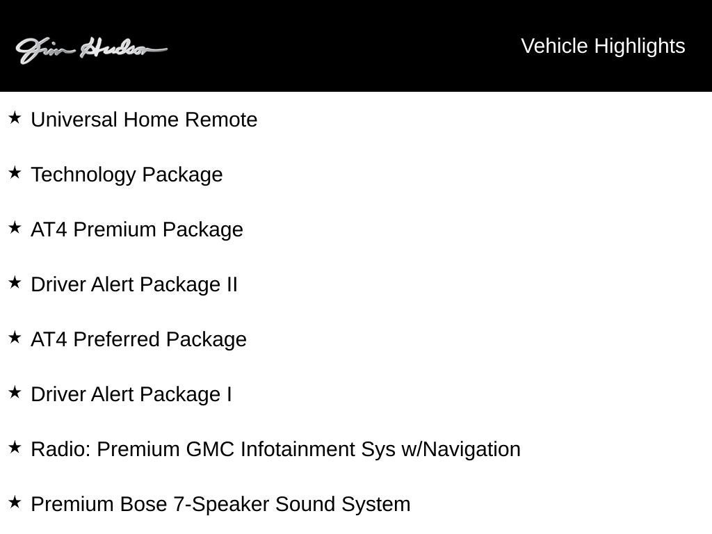 2020 GMC Sierra 1500 AT4 10-Speed Automatic, 4WD, Jet Black w/Kalahari Accents w/Perforated Leather-Appointed Front Seat Trim, 8 Driver Information Center, Adaptive Cruise Control - Camera, AT4 Preferred Package, AT4 Premium Package, Automatic Emergency Braking, Bed View Camera, Driver Alert Package I, Driver Alert Package II, Following Distance Indicator, Forward Collision Alert, Front Pedestrian Braking, HD Surround Vision w/2 Trailer View Camera Provisions, High Gloss Black Mirror Caps, IntelliBeam Automatic High Beam On/Off, Lane Change Alert w/Side Blind Zone Alert, Lane Keep Assist w/Lane Departure Warning, Multicolor 15 Diagonal Head-Up Display, Perimeter Lighting, Power Sliding Rear Window w/Rear Defogger, Power Sunroof, Premium Bose 7-Speaker Sound System, Radio: Premium GMC Infotainment Sys w/Navigation, Rear Camera Mirror, Rear Cross Traffic Alert, Safety Alert Seat, Technology Package, Ultrasonic Front & Rear Park Assist, Universal Home Remote, Wheels: 20 x 9 Machined Aluminum, Wireless Charging.