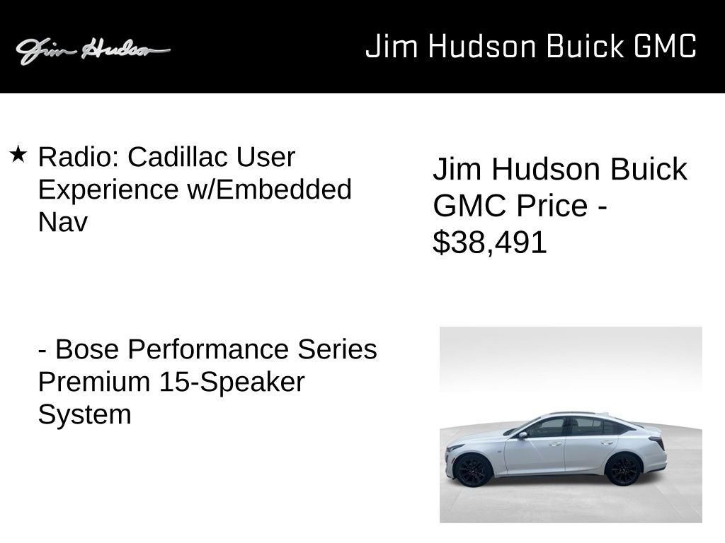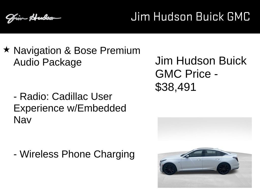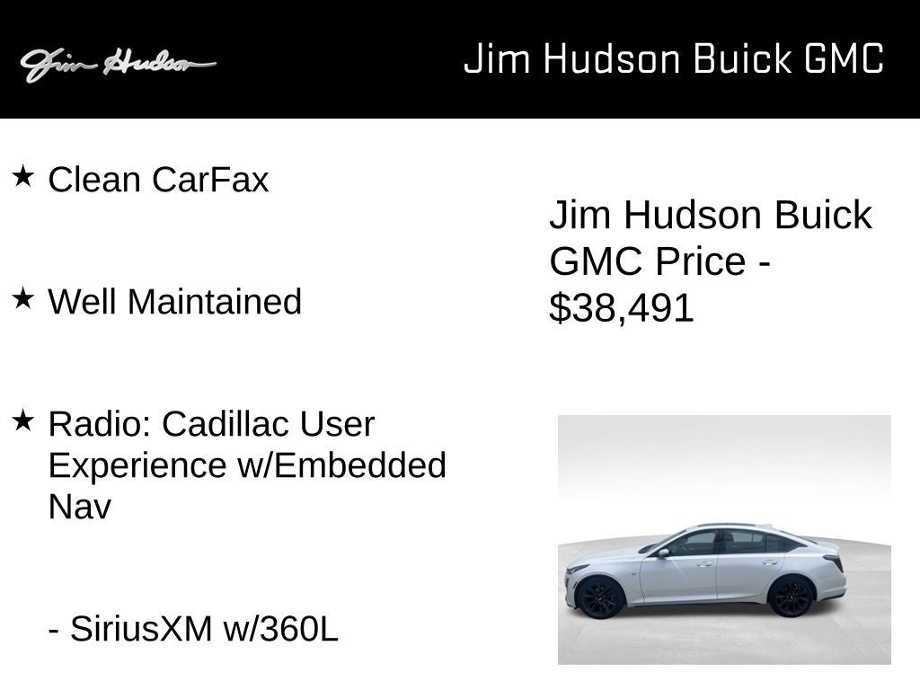 2021 Cadillac CT5 Sport Clean CarFax, Well Maintained, Apple CarPlay/Android Auto, Climate Package, Driver Awareness Plus Package w/o Super Cruise, Driver Power Lumbar Massage Seat, Following Distance Indicator, Front Passenger Power Lumbar Massage Seat, Heated Driver & Front Passenger Seats, Heated Steering Wheel, IntelliBeam Auto High Beam Assist, Lane Keep Assist w/Lane Departure Warning, Navigation & Bose Premium Audio Package, Radio: Cadillac User Experience w/Embedded Nav, Ventilated Driver & Front Passenger Seats, Wireless Phone Charging, 4-Wheel Antilock 4-Wheel Disc Brakes, 4-Wheel Disc Brakes, 9 Speakers, ABS brakes, Air Conditioning, All-Weather Cargo Mat (LPO), All-Weather Floor Mats, Alloy wheels, AM/FM radio: SiriusXM with 360L, Auto-dimming door mirrors, Auto-dimming Rear-View mirror, Automatic Emergency Braking, Automatic Stop/Start w/Disable, Automatic temperature control, Body-Color Heated Pwr-Adjustable Outside Mirrors, Bose Performance Series Premium 15-Speaker System, Brake assist, Bumpers: body-color, Chrome Wheel Locks (LPO), Compass, Delay-off headlights, Driver 4-Way Power Lumbar Seat Adjuster, Driver door bin, Driver vanity mirror, Dual Diagonal Color Driver Information Center, Dual front impact airbags, Dual front side impact airbags, Electronic Stability Control, Emergency communication system: OnStar and Cadillac connected services capable, Exterior Parking Camera Rear, Four wheel independent suspension, Front anti-roll bar, Front Bucket Seats, Front Center Armrest, Front Cornering LED Lamps, Front dual zone A/C, Front License Plate Bracket, Front Passenger 4-Way Power Lumbar Seat Adjuster, Front reading lights, Fully automatic headlights, Garage door transmitter, HD Radio, HD Rear Vision Camera, Heated door mirrors, Illuminated entry, Illuminating Door Handles, Illuminating Front Sill Plates, Inside Rear-View Auto-Dimming Mirror, Interior Protection Package (LPO), Knee airbag, Leather steering wheel, Leatherette Seating Surfaces, LED Reflective Windshield Alert, Lighting Package, Low tire pressure warning, Manual Tilt & Telescoping Steering Column, Memory seat, Occupant sensing airbag, Outside temperature display, Overhead airbag, Overhead console, Panic alarm, Passenger door bin, Passenger vanity mirror, Power door mirrors, Power driver seat, Power passenger seat, Power steering, Power windows, Preferred Equipment Group 1SE, Premium 9-Speaker Audio System Feature, Radio data system, Radio: Cadillac User Experience, Rain sensing wipers, Rear anti-roll bar, Rear Park Assist, Rear reading lights, Rear seat center armrest, Rear window defroster, Remote keyless entry, Ride & Handling Suspension, SiriusXM w/360L, Speed control, Speed-sensing steering, Split folding rear seat, Spoiler, Steering wheel mounted audio controls, Tachometer, Telescoping steering wheel, Tilt steering wheel, Traction control, Trip computer, Turn signal indicator mirrors, UltraView Dual Pane Sunroof, Variably intermittent wipers, Voltmeter, Wheels: 19 Alloy w/Pearl Nickel Finish, Wheels: 19 Alloy w/Satin Graphite Finish, Apple CarPlay/Android Auto, Climate Package, Driver Awareness Plus Package w/o Super Cruise, Driver Power Lumbar Massage Seat, Following Distance Indicator, Front Passenger Power Lumbar Massage Seat, Heated Driver & Front Passenger Seats, Heated Steering Wheel, IntelliBeam Auto High Beam Assist, Lane Keep Assist w/Lane Departure Warning, Navigation & Bose Premium Audio Package, Radio: Cadillac User Experience w/Embedded Nav, Ventilated Driver & Front Passenger Seats, Wireless Phone Charging.