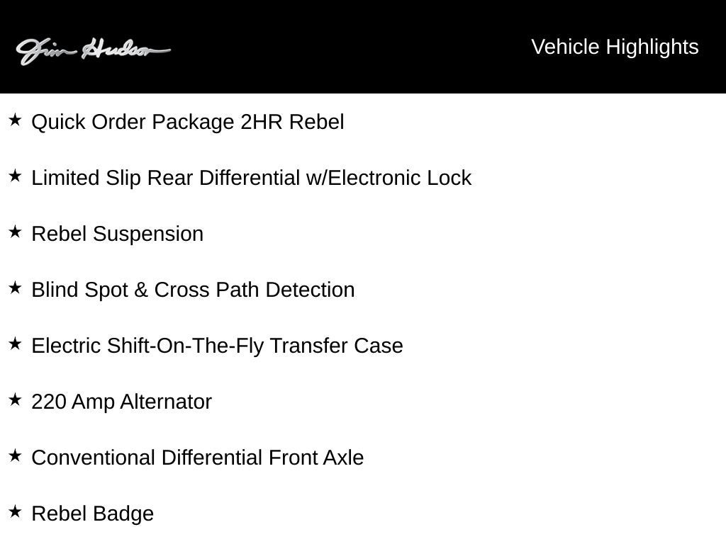 2024 Ram 2500 Rebel 220 Amp Alternator, 4x4 Badge, Blind Spot & Cross Path Detection, Conventional Differential Front Axle, Electric Shift-On-The-Fly Transfer Case, Instrument Cluster Theme 2 - Rebel, Limited Slip Rear Differential w/Electronic Lock, Painted Semi-Texture Film Instrument Panel Bezels, Power Deployable Running Boards, Quick Order Package 2HR Rebel, Rebel Badge, Rebel Instrument Panel Badge, Rebel Suspension, Wheels: 20 x 8.0 Black Diamond Cut Aluminum.