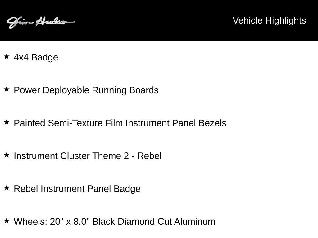 - Wheels: 20" x 8.0" Black Diamond Cut Aluminum