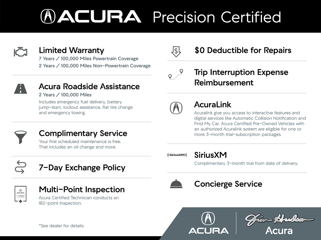As an Acura Precision Certified vehicle, this Integra has undergone a rigorous 182-point inspection, ensuring it meets the highest standards of quality and reliability. Enjoy the peace of mind that comes with a Transferable Warranty, Roadside Assistance, and a Limited Warranty that extends for 24 months or 100,000 miles after the original new car warranty expires. Additionally, you'll benefit from complimentary services such as the first scheduled maintenance, a 3-month AcuraLink trial, and a 3-month SiriusXM Radio subscription.
