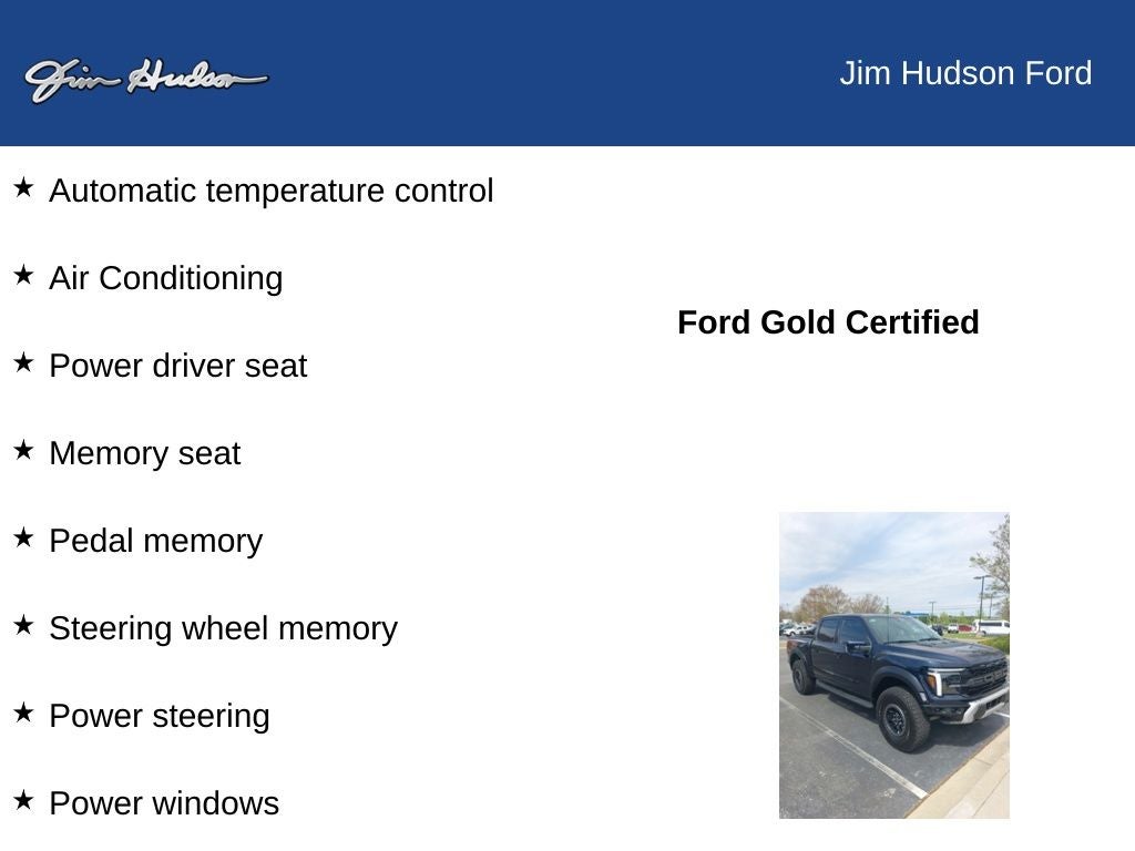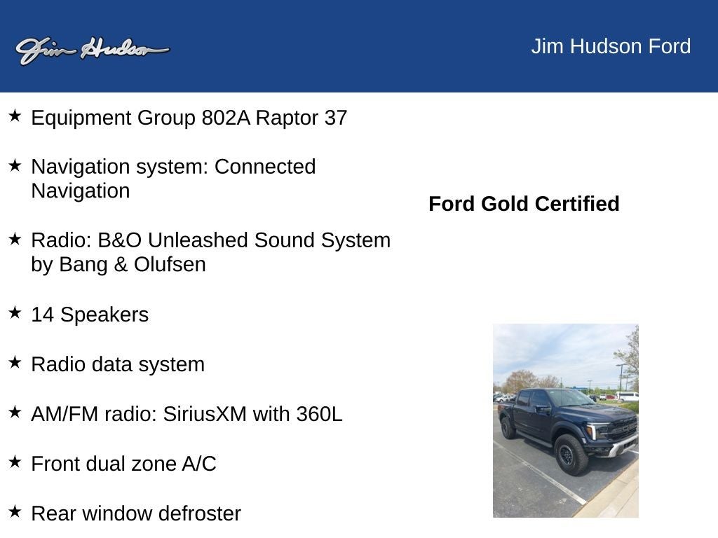 2025 Ford F-150 Raptor 4WD, 14 Speakers, Air Conditioning, AM/FM radio: SiriusXM with 360L, Automatic temperature control, Carbon Fiber Interior Appliques, Dual Valve Shocks, Equipment Group 802A Raptor 37, Front dual zone A/C, Heads-Up Display, Memory seat, Modular Front Bumper, Navigation system: Connected Navigation, Pedal memory, Power driver seat, Power steering, Power windows, Radio data system, Radio: B&O Unleashed Sound System by Bang & Olufsen, Rear window defroster, RECARO Alcantara Suede Front Seats, Remote keyless entry, Steering wheel memory, Steering wheel mounted audio controls, SYNC 4 w/Enhanced Voice Recognition, Twin Panel Moonroof, Wheels: Raptor 37 Unique 17 Cast Aluminum.